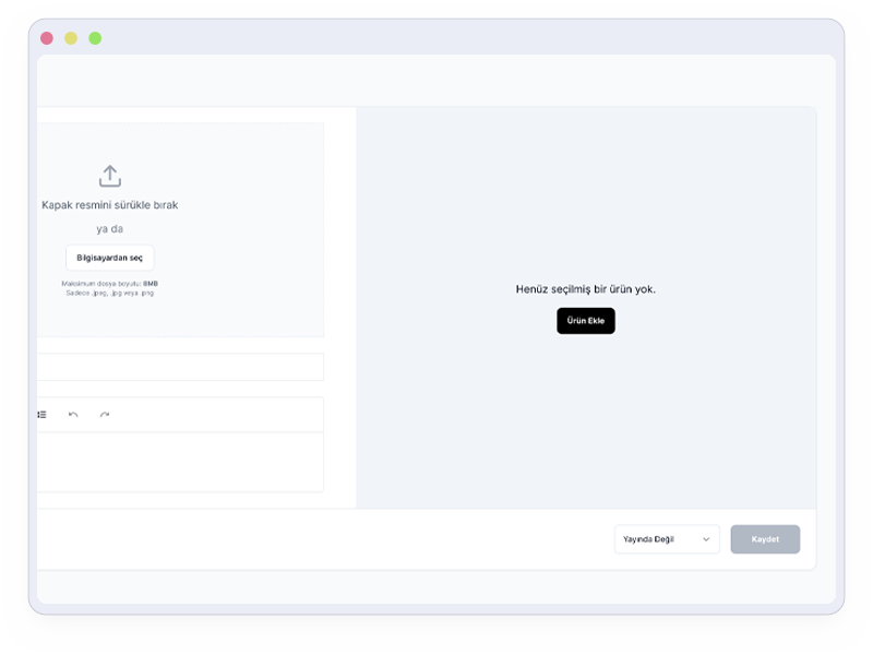 Koleksiyon sayfan için bir kapak fotoğrafı yüklemen gerekiyor. Koleksiyon adı, açıklaması gibi bilgileri girmenin hemen ardından sağ taraftaki “Ürün Ekle” butonuna basarak koleksiyon içeriğini belirleyebilirsin.