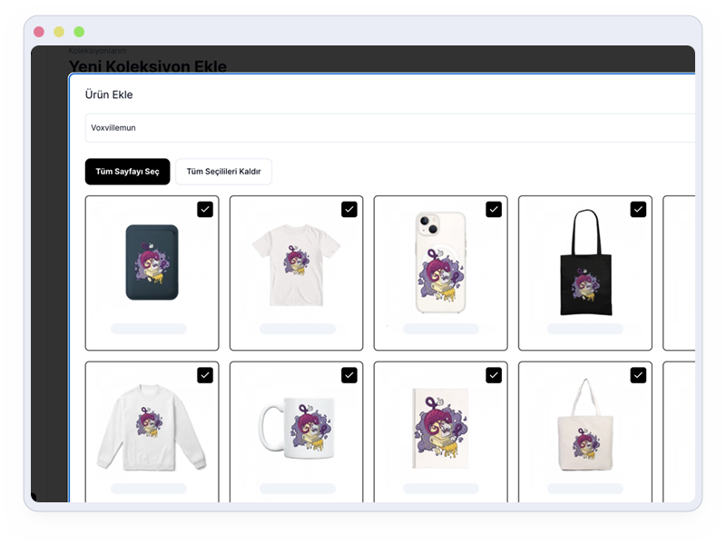 Ürün ekle butonuna bastığında açılan pencerede güncel ürünlerin listelenir. Tasarım ya da ürün adıyla arama yaparak ürünlerini filtreleyebilirsin. Seçimlerini yapıp ürün ekle dediğinde, koleksiyon listesine eklenecek. Listeye eklenen tasarımların sıralamasını dilediğin gibi ayarlayabilirsin.