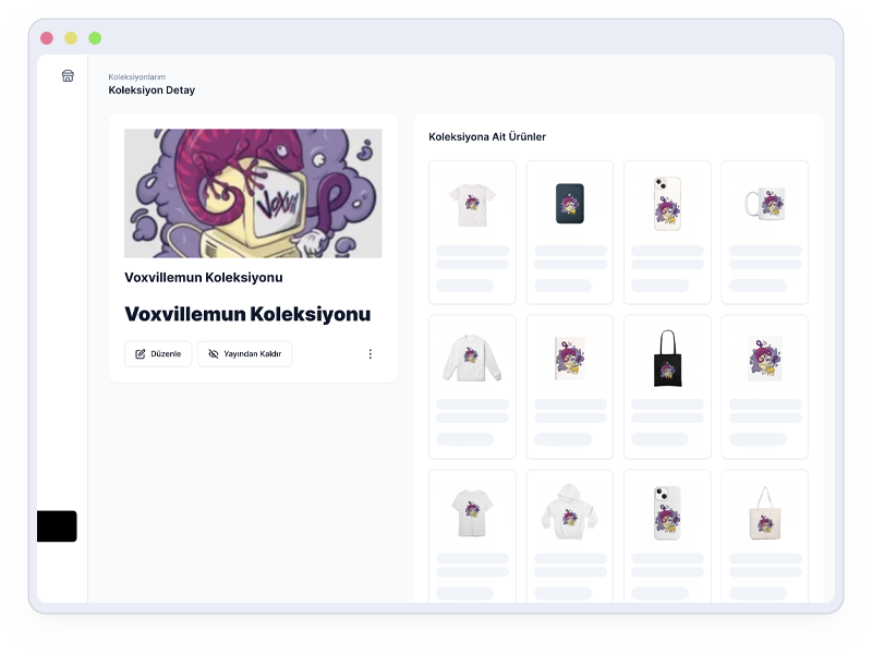 Bir ya da birden fazla tasarıma ait ürünleri, bir koleksiyon altında toplamak istersen Paneldeki “Koleksiyonlarım” menüsü altından gerçekleştirebilirsin.