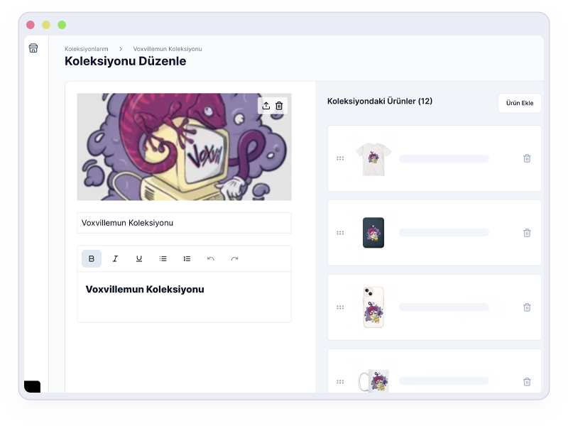 Koleksiyon adı, açıklaması, kapak görseli ve ürünlerini güncelleyebilirsin.