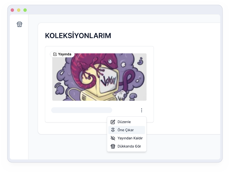 Ekli bir koleksiyonu öne çıkararak dükkanında ilk sırada listelenmesini sağlayabilirsin. Bunun için öne çıkarmak istediğin koleksiyonun sağ alt köşesinde bulunan 3 nokta ikonuna tıklayarak “Öne Çıkar” seçeneğini seçebilirsin.