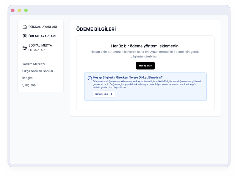 Bu profiller ödeme alabilmek için kullanılacak yöntemi belirlemektedir. Aşağıdaki yöntemlerle ödeme talebi için profil oluşturabilirsin.
