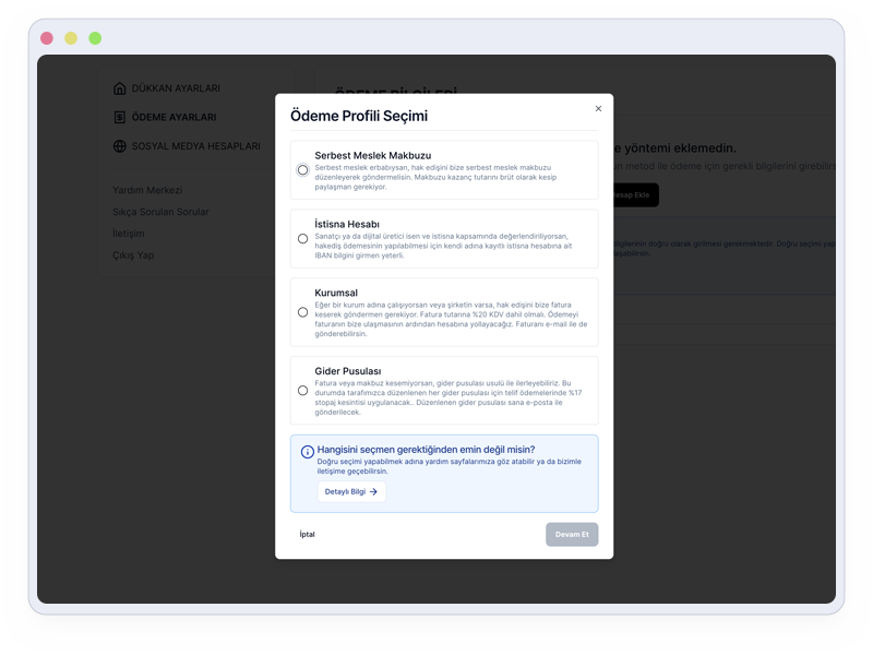 Ödemelerin vergilendirilmesi ve doğru şekilde aktarımı için “Ödeme Ayarları” sayfasında, en uygun “Ödeme Profili” seçmeniz gerekiyor.
