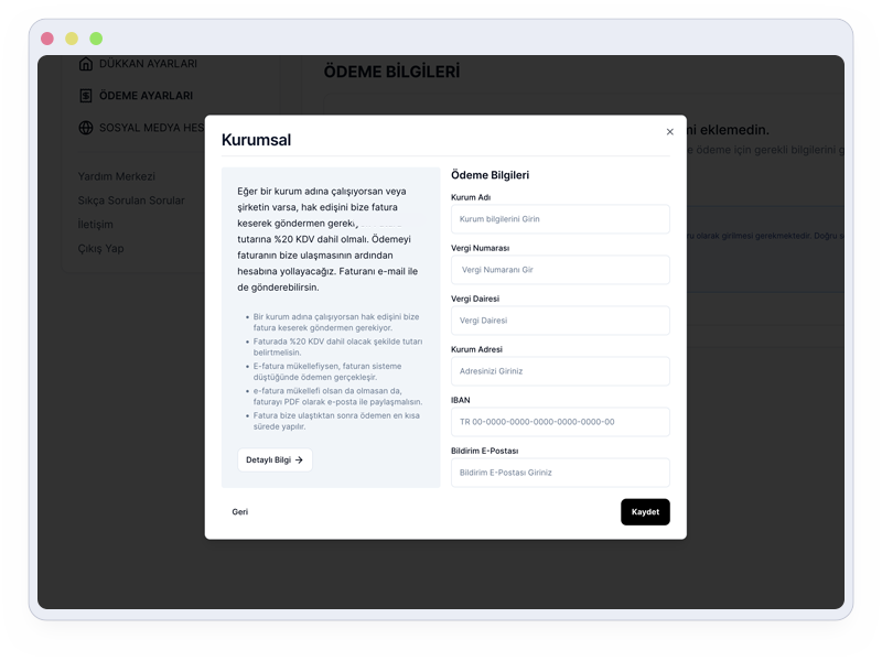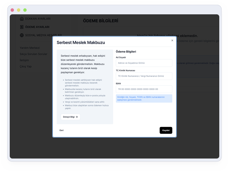 Tasarımların ile satılan her bir ürün için belirlediğin oranda kazanç elde edersin. Elde ettiğin aktif kazanç miktarı 500 TL’yi aştığında aktarım talebinde bulunabilirsin. Ödemen, “Dükkan Ayarları” altındaki “Ödeme Ayarları” sayfasında belirlemiş olduğun Ödeme profiline ait IBAN numarasına gönderilir.