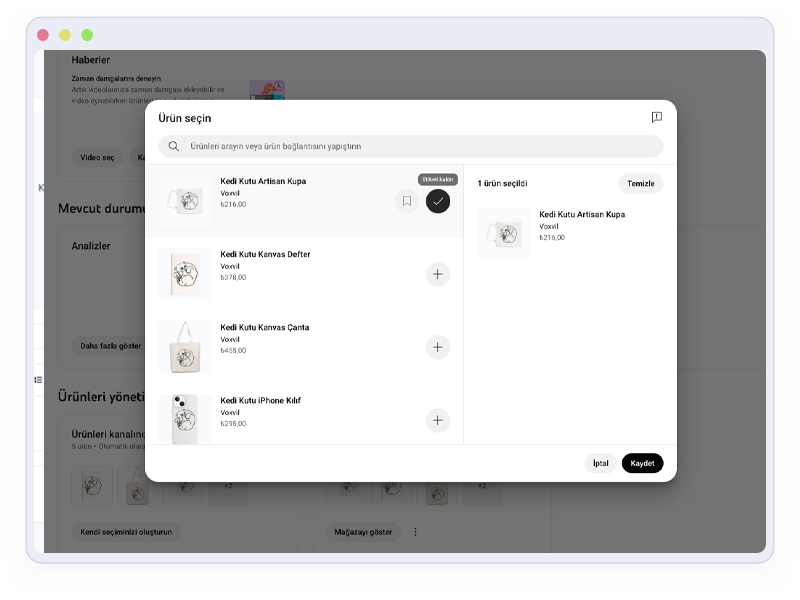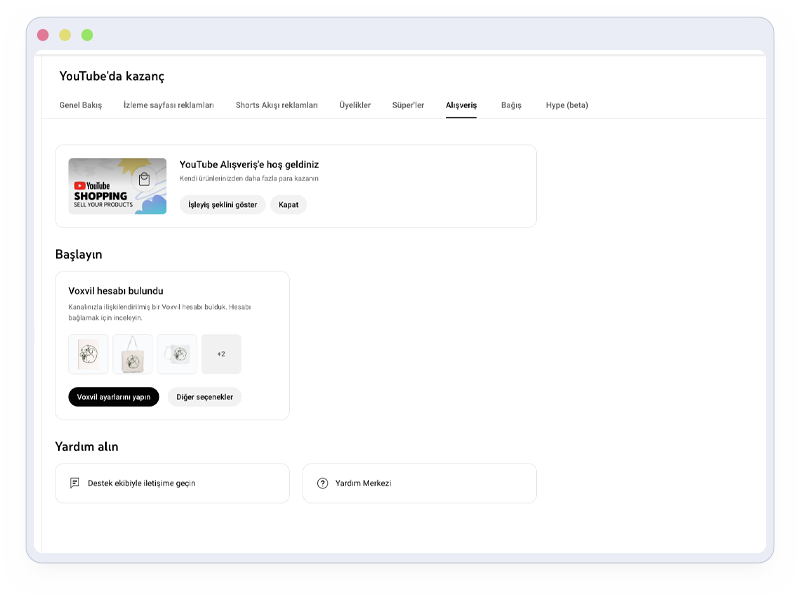 Eğer kanalında 1.000'den fazla abone varsa ve para kazanma özelliğin açıksa, Voxvil mağazanı YouTube hesabınıza bağlayabilirsin. Böylece videolarınıza ve kanalınıza doğrudan ürünlerinizi tanıtan tıklanabilir bağlantılar ekleyebilir, izleyicilerini kolayca müşteriye dönüştürebilirsin.