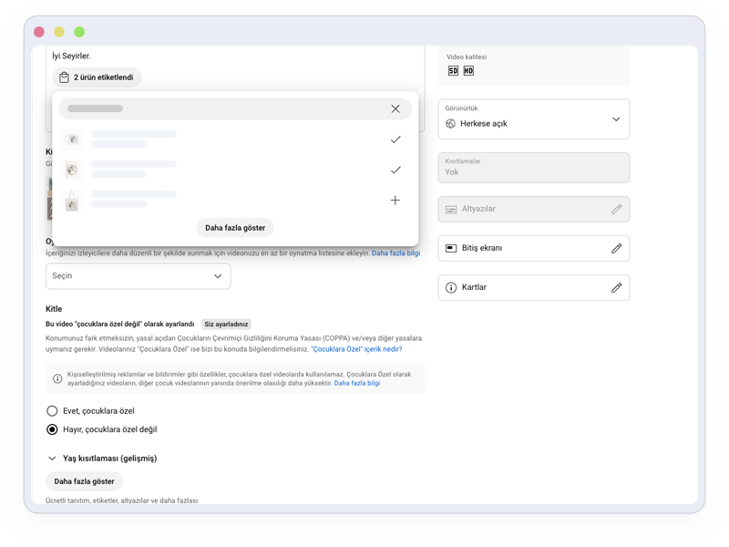Paylaştığın videolarda görünmesini istediğin ürünleri de video açıklama alanında yer alan "Ürünler" butonuna tıklayarak seçebilirsin.